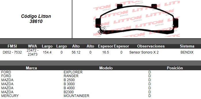 PASTILLA DE FRENO FORD EXPLORER- RANGER 95> DEL. ULT. (0349) (PD/332) |