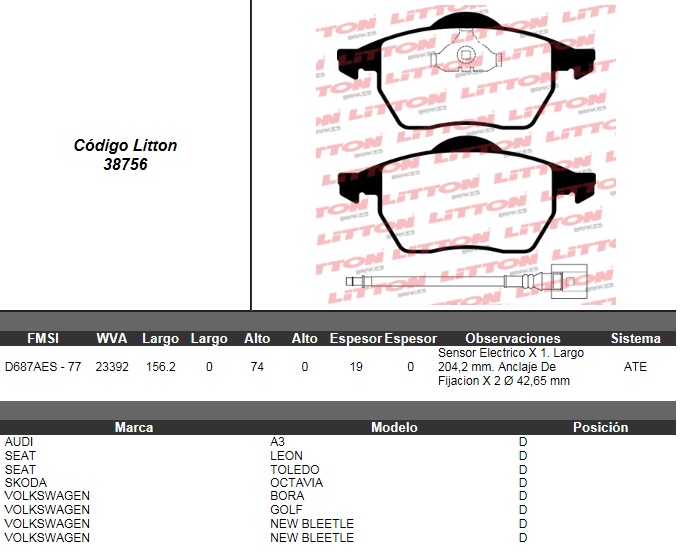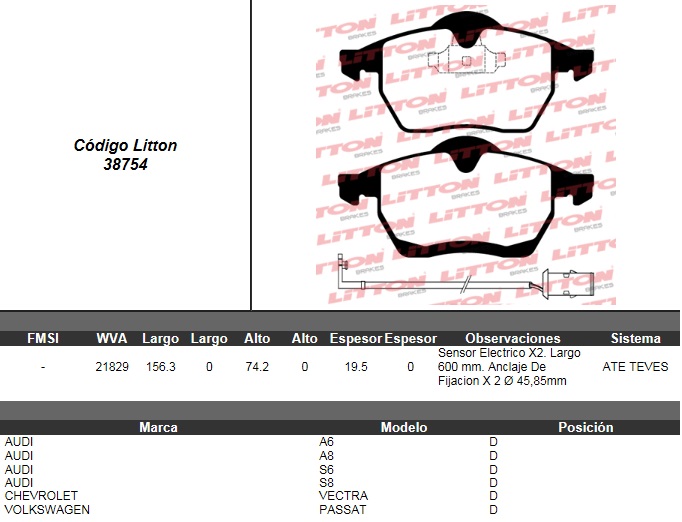 PASTILLA DE FRENO CHEVROLET VECTRA 2.0 CD 16V 96>98- VECTRA 2.2 CD 16V 98>- VECTRA 2.0 CD TD- 2.5 CD 24V 99>- VECTRA GLS 2.2 16V 99> C/SENSOR LARGO DEL. ULT. (0655) (PD/61)