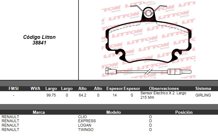 PASTILLA DE FRENO RENAULT 19(IMP)-CLIO 16V C/CABLE ULT.(0193/1) |