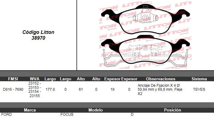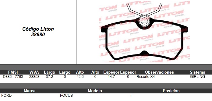 PASTILLA DE FRENO FORD FOCUS NAFTA-DIESEL TRAS. NA (0540) |