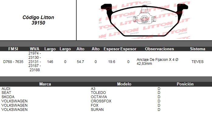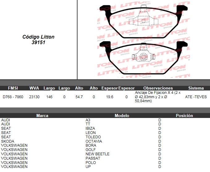 PASTILLA DE FRENO VW. BORA 2.0 00>- GOLF 1.6/1.8/1.9/2.0 8V 99/03>02 / AUDI A3 1.6/1.8/1.8 T/2.0 97/03>02 / SEAT LEON-TOLEDO 1.6/1.8 20V/1.9 TDI 99> DEL. ULT. (0643) (PD/58) |