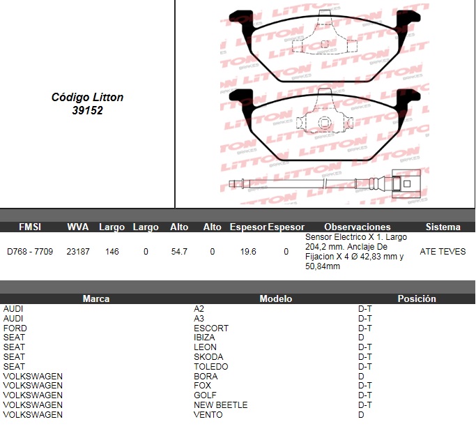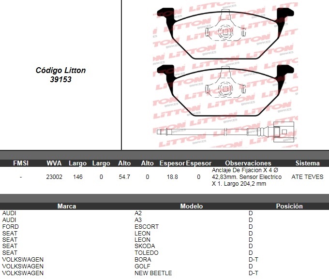 PASTILLA DE FRENO VW. BORA 2.0 00>- GOLF 1.6/1.8/1.9/2.0 8V 99/03>03- NEW BEATLE 2.0 8V 99> / AUDI A3 1.6/1.8/1.8 T/2.0 97/03>02 / SEAT LEON 1.6/1.8 20V/1.9 TDI 99> DEL. C/SENSOR ULT. (0625) (PD/58-B) |