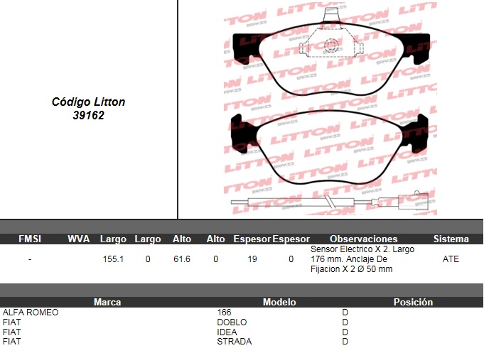 PASTILLA DE FRENO FIAT IDEA 1.8 ADVENTURE 05/03>10- DOBLO 1.8 ADVENTURE 06/02>03/10- STRADA 09> / ALFA ROMEO 166 DEL. C/SENSOR ULT. (PD/78-A) |