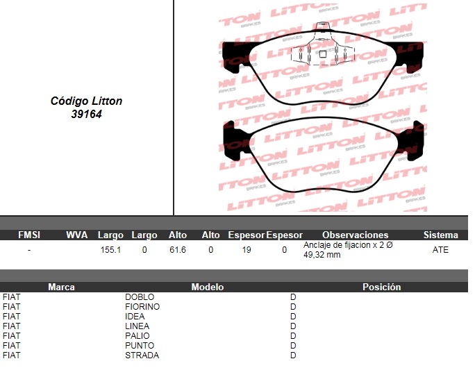 PASTILLA DE FRENO FIAT DOBLO 1.8 ADVENTURE 04/10>- BRAVO 1.4 T-JET 12>- FIORINO 750 KG 08/10>- IDEA ADVENTURE 1.8 04/10>- STRADA ADVENTURE 04/10>- LINEA 1.9 04/10> DEL. ULT. (0989) (PD/92)