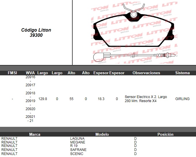 PASTILLA DE FRENO RENAULT LAGUNA 1.8 16V RXE 99>/2.0 RXT- 3.0 V6 24V RXT- RXE TD. 98>/2.0 RT 8V- 1.9 D RT 96>/2.0 16V RXE 95>- MEGANE 1.6- 1.9 D- 2.0- COUPE 97>- SCENIC 1.9 D- 2.0 DEL. C/SENSOR ULT. ( |