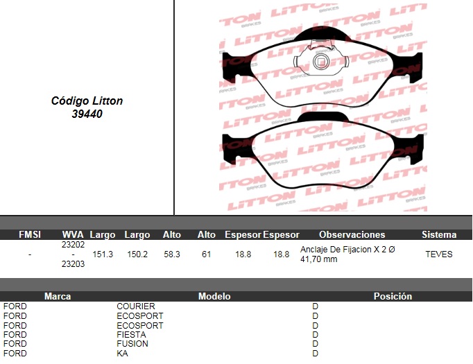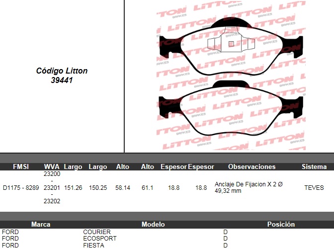 PASTILLA DE FRENO FORD ECOSPORT 1.0 /1.4D/ 1.6/ 2.0 03/02>09- FIESTA 1.0 SOHC 1.4D/ 1.6 SOHC (TODOS CON ABS) 02> DEL. ULT. (0619) (PD/497) |