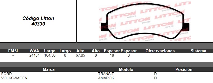 PASTILLA DE FRENO FORD TRANSIT 1.8-2.2-2.4 TDCI FWD-4WD 06/- 2.3-3.2 16C RWD-4 WD 06/- 3330-3550 2.4 06/08- DEL. ULT. (1110) |