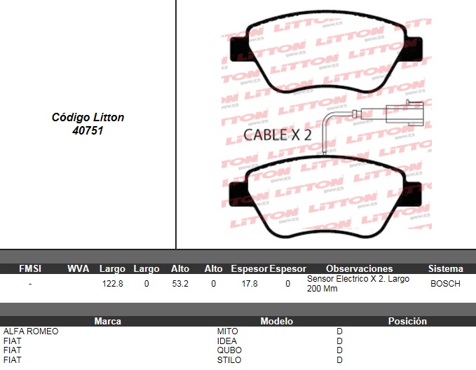 PASTILLA DE FRENO FIAT SIENA 02/ STILO 01/ IDEA 04/ 500-BRAVO-LINEA 07/ QUBO 11/ FIORINO 08/10 PUNTO-LINEA 10/ ALFA MITO 08/ CITROEN NEMO 08/ D. NA (0736)