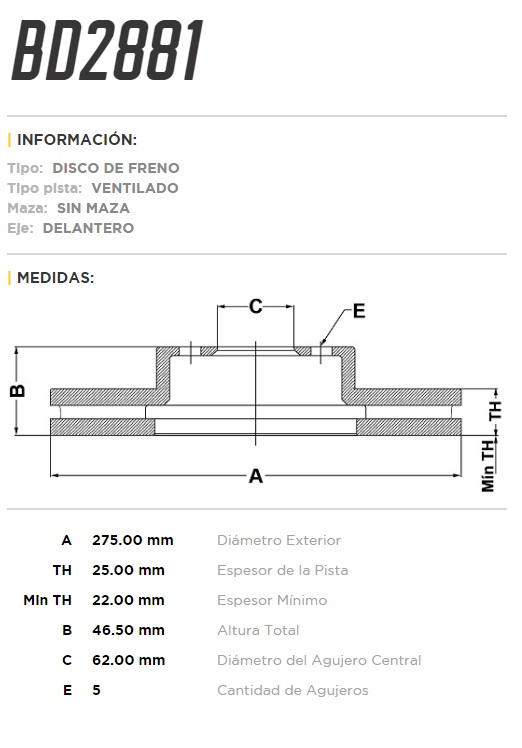DISCO DE FRENO TOYOTA RAV 4 2.4 16V 13/16 D-V 275-62-46.5-5 |