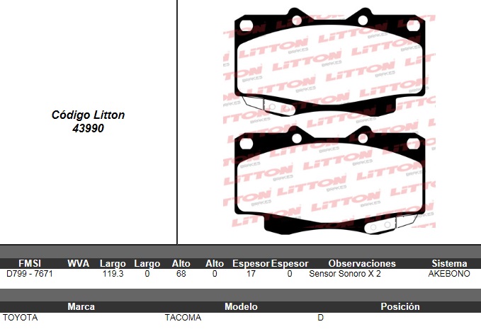 PASTILLA DE FRENO TOYOTA TACOMA 4X2 4X4 99/DEL. NA (0638) |