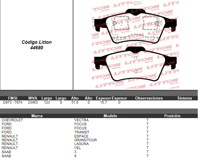 PASTILLA DE FRENO CHEVROLET VECTRA C- C GTS 02/ TRAS. NA / FORD TRANSIT VI CONNECT 02/ - RENAULT ESPACE IV 02/- LAGUNA I |
