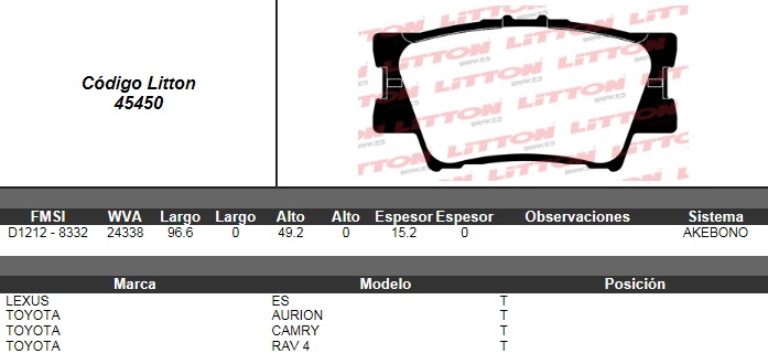 PASTILLA DE FRENO TOYOTA CAMRY 06>- CAMRY 2.4L/3.5 L 08/10- RAV4 2.4L 06>- RAV4 2.4L 3RD 06>- RAV4 2.5 4X4 14>- RAV4 3.5L 06> TRAS. ULT. (0862) (PD/753) |