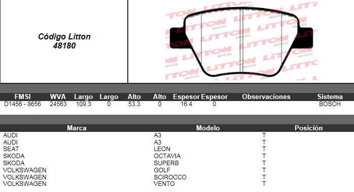 PASTILLA DE FRENO VW. BORA 2.0 11>- GOLF VI 09>- SCIROCCO 08> / AUDI A3 09>- A3 QUATTRO 09>- A3 SPORTBACK 09> TRAS. ULT. (0993) (PD/1465) |