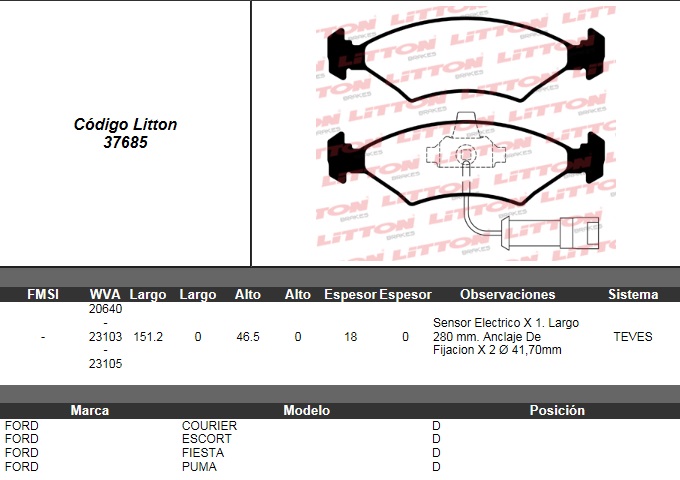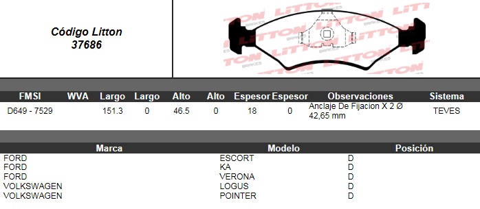 PASTILLA DE FRENO FORD COURIER 1.3 97- COURIER 1.6 97- ESCORT 1.6 93>96- ESCORT 1.8 93>96- FIESTA 98>00- FIESTA 1.4 16V 96- KA 1.6L 01>08- POINTER 1.8 / 2.0 / 2.0 GLI 93>96 DEL. ULT. (--) (PD/34)