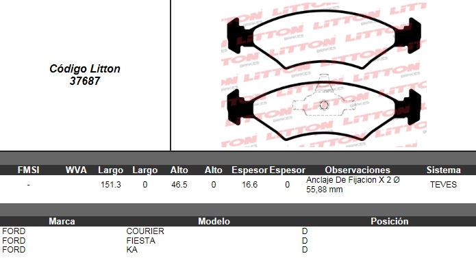 PASTILLA DE FRENO FORD COURIER 1.6 03/09>- FIESTA 1.0 SOHC 03/09>- FIESTA 1.6 SOHC 03/09>10- FIESTA KINETIC 1.6 10/ DEL. ULT. (0986) (PD/79)