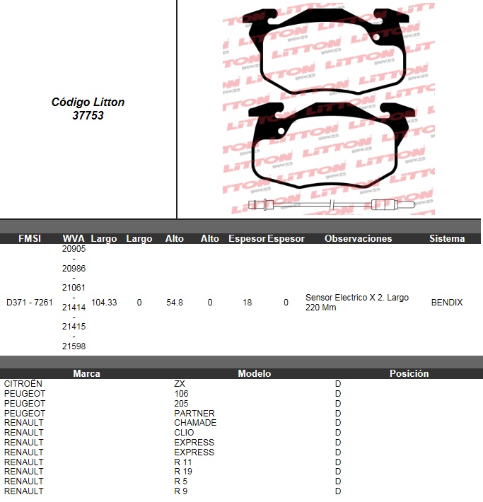 PASTILLA DE FRENO RENAULT CLIO 94>96- EXPRESS 95>- FUEGO 84>91- R9/R11 85>- R19 RN/RT 93> / PEUGEOT 106 97>- 205 XS/XSI/JUNIOR 1.9 CTI 93>- 306 95>- 405 GL 92> / CITROEN SAXO 1.1/1.5 D/1.6 DEL. C/SENS |