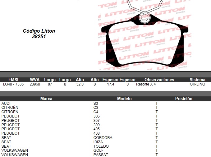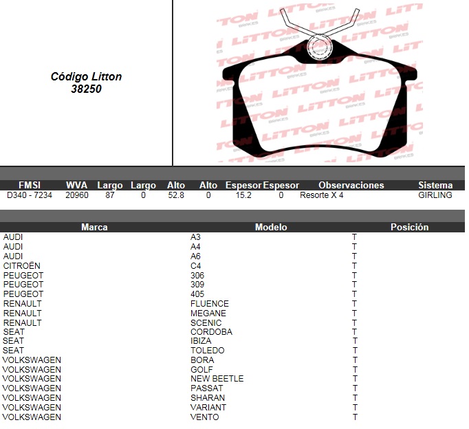 PASTILLA DE FRENO VW. GOLF 2.0 00>07- GOLF 1.8T 00>04- BORA 2.0 99>09- BORA 1.8T / PEUGEOT 307 SW 03>08- 307 XR/XS/XT 2.0L 03>08 / AUDI A3 99>01- A4 QUATTRO 01>04- TT 00>TRAS. ULT. (0184) (PD/59) |