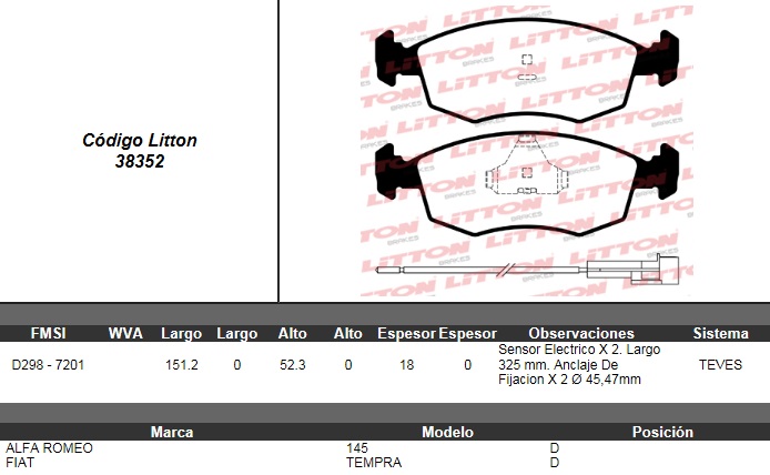 PASTILLA DE FRENO FIAT PALIO WEEKEND 1.6 STILE/1.6 16V/1.7 TD/1.7 TD STILE- SIENA 16V 97>- TEMPRA 16V/8V 95>- TEMPRA TURBO- TIPO 2.0 16V 94> DEL. C/SENSOR ULT. (0328) (PD/48-A)