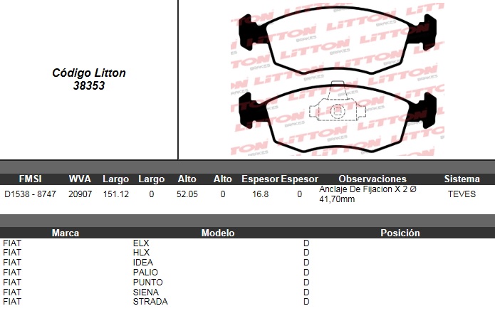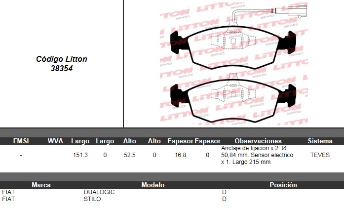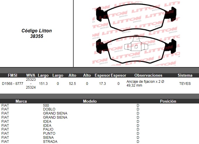 PASTILLA DE FRENO FIAT IDEA 05>09- PALIO 1.6 16V 98>00- PALIO WEEKEND 1.5/1.6 16V 97>00- PALIO/STRADA 1.5 8V/1.6/1.6 16V 99>- PALIO WEEKEND 1.3 16V ELX FIRE 00>- PALIO 1.6 16V ELX 01>09 DEL. ULT. (054