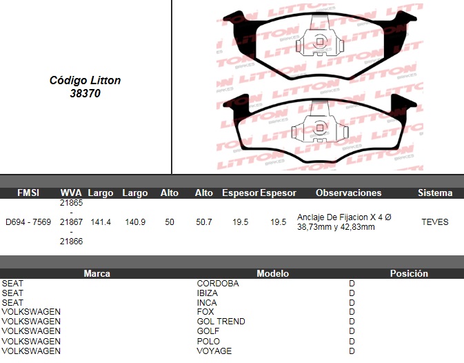 PASTILLA DE FRENO VW. GOLF 1.8 GL/GLX 95>- POLO CLASSIC DIESEL <11-96- FOX 1.0 03>- SAVEIRO 1.6 MI/1.8 MI- VOYAGE 1.6 8V- GOL TREND 1.6 8V / SEAT CORDOBA 1.7 SDI/1.9D/SDI/TD D./SOLIDO DEL. ULT. (0370 |