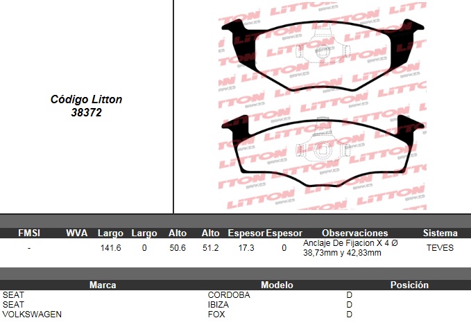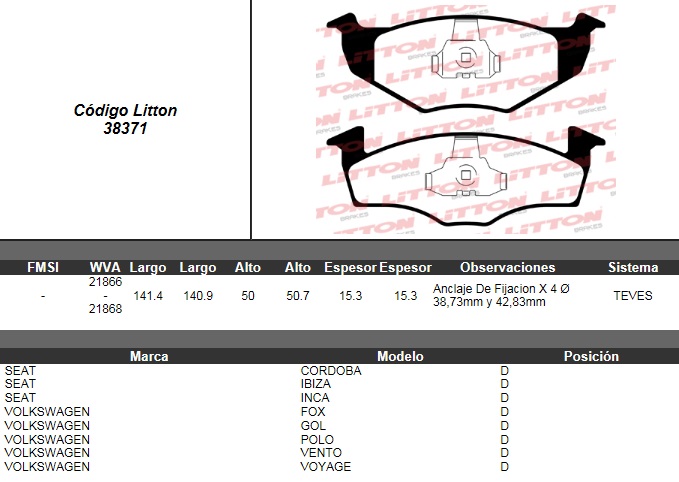 PASTILLA DE FRENO VW. GOLF 1.8 GL/GLX 95>- POLO CLASSIC DIESEL <11-96- FOX 1.0 03>- SAVEIRO 1.6 MI/1.8 MI- VOYAGE 1.6 8V- GOL TREND 1.6 8V / SEAT CORDOBA 1.7 SDI/1.9D/SDI/TD DISCO SOLIDO DEL. ULT. (04 |