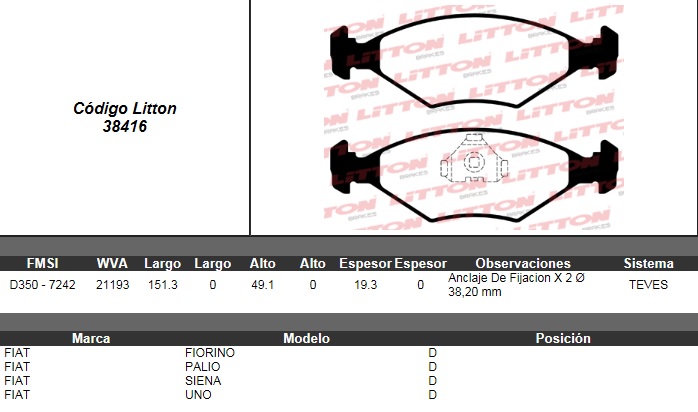 PASTILLA DE FRENO FIAT FIORINO 87>93- UNO 84>96- PALIO ED/EDX 1.0 96>97- 1.5 96>- 1.6 16V 96>97- PALIO WEEKEND 1.5 97>- SIENA EL 1.6/EL 1.6 16V/ HL 1.6 16V 97>- UNO 1.0 FIRE 09/09>09 DEL. ULT. (0302B)