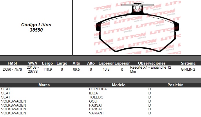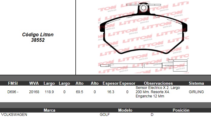 PASTILLA DE FRENO VW. GOLF 1.8 GT-1.9 TD-CHERY TIGGO 2.0 16V.10/ C/SENSOR 16.3MM DEL. ULT. (0654) |