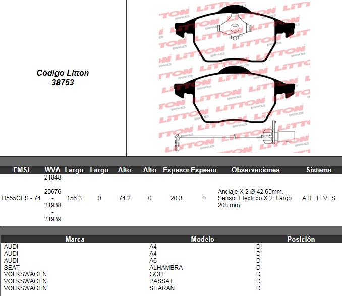 PASTILLA DE FRENO VW. PASSAT 2.8 VR6 93>96- PASSAT 1.8 20V TURBO/ 2.0 20V 97> / AUDI A4 1.8- A6 1.8 94> DEL. C/SENSOR ULT. (0550) (PD/384-A) |