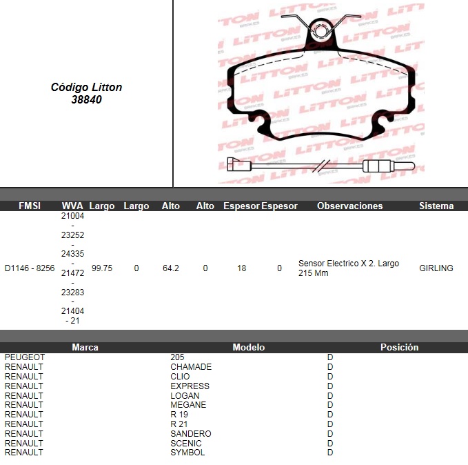 PASTILLA DE FRENO RENAULT 19(IMP)-CLIO 16V C/CABLE ULT.(0193/1) |