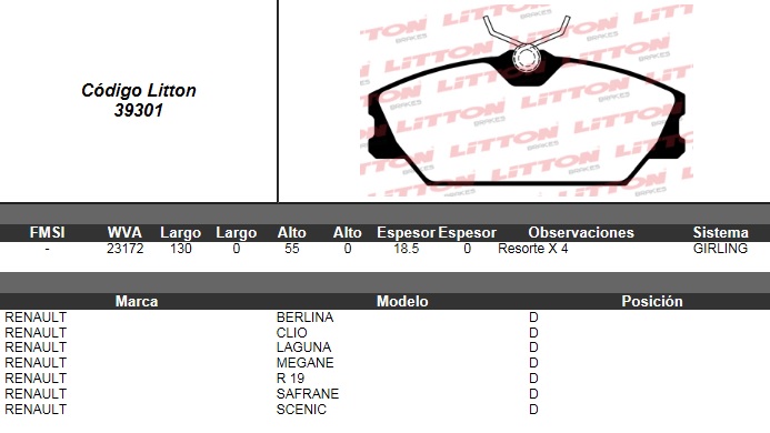 PASTILLA DE FRENO RENAULT LAGUNA 1.8 16V RXE 99>/2.0 RXT- 3.0 V6 24V RXT- RXE TD. 98>/2.0 RT 8V- 1.9 D RT 96>/2.0 16V RXE 95>- MEGANE 1.6- 1.9 D- 2.0- COUPE 97>- SCENIC 1.9 D- 2.0 DEL. C/SENSOR ULT. ( |