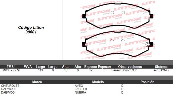 PASTILLA DE FRENO CHEVROLET AVEO 04/10> / DAEWOO LEGANZA KLAV 2.2I 16V CDX 06/97>12/02 DEL. ULT. (0491B) (PD/817) |