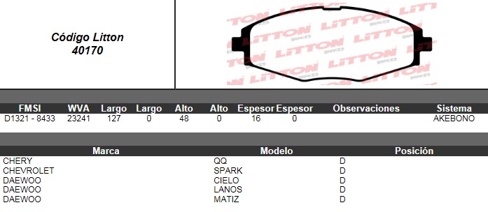 PASTILLA DE FRENO CHEVROLET SPARK 1.0 05/05> / CHERY QQ 11/ / DAEWOO LANOS 97>- MATIZ 04/05- MATIZ 0.8 98>- MATIZ 1.0 03> DEL. ULT. (0493) (PD/598) |