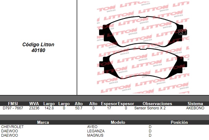 PASTILLA DE FRENO CHEVROLET AVEO 1.6L 10> / DAEWOO CIELO 1.5 GL/GLE/GLX/GTX- ESPERO 1.5I 16V/1.8 CD/2.0 CD/- LANOS 1.4 SE/1.5 SE/1.5 SX/ 1.6 SX 16V DEL. RESPALDO CON TETON ULT. (0490) |