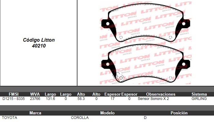 PASTILLA DE FRENO TOYOTA COROLLA SE-G 1.8 16V/XEI 1.8 16V/XEI 2.0/XLI 1.6 16V 06/02>- COROLLA FIELDER XEI 1.8 04> DEL. ULT. (0716) (PD/491) |