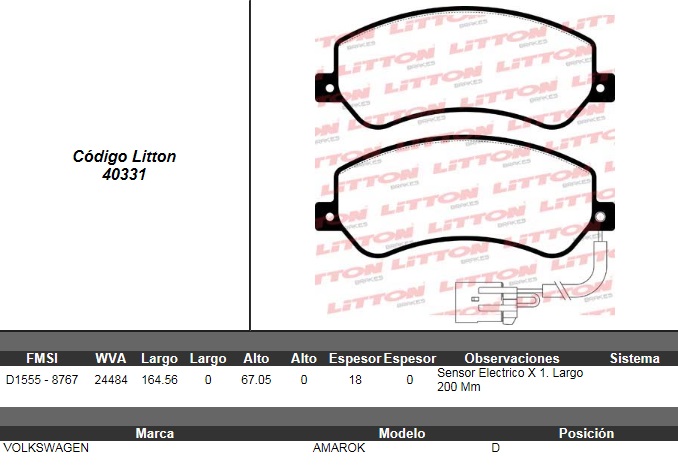 PASTILLA DE FRENO VW. AMAROK TRENDLINE CD 2.0 16V 10>- HIGHLINE CD 2.0 16V / DEL. C/SENSOR ULT. (0980B) |