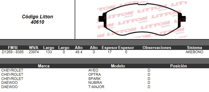 PASTILLA DE FRENO CHEVROLET AVEO 06>- SPARK 1.0/1.2 03/10> / DAEWOO KALOS 1.2 03>- KALOS 1.4 02> DEL. ULT. (0494) (PD/818) |