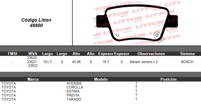 PASTILLA DE FRENO TOYOTA COROLLA- PREVIA 03/ TRAS. ULT. (0946) |