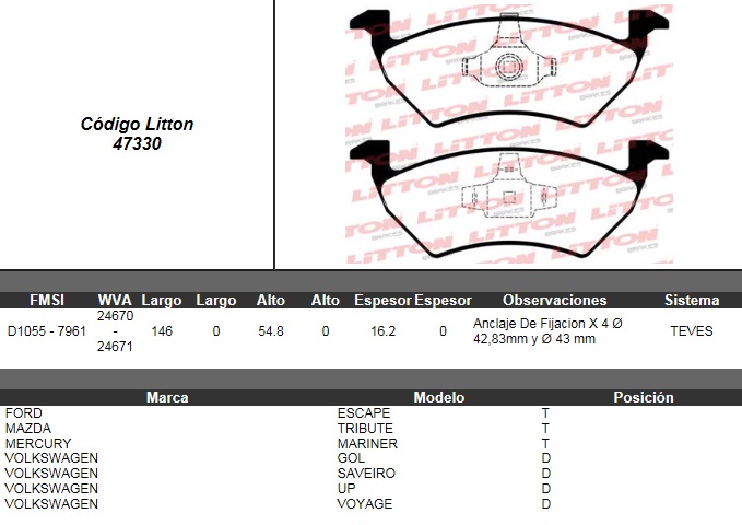 PASTILLA DE FRENO VOLKSWAGEN GOL TREND VOYAGE 1.0 1.6 SAVEIRO 1.0 1.6- CROSS- HIGHLINE- STARTLINE DELANTERO |
