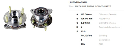 MAZA DE RUEDA CHEVROLET ONIX- COBALT- PRISMA- SPIN 1.4/1.8 8V 17/ DEL. S/ABS 123-106-4-25 EST.