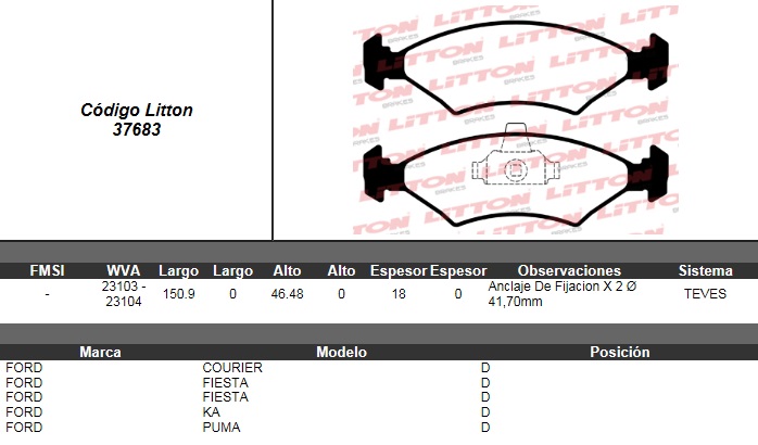 PASTILLA DE FRENO FORD COURIER 1.6 03/09>- FIESTA 1.0 SOHC 03/09>- FIESTA 1.6 SOHC 03/09>10- FIESTA KINETIC 1.6 10/ DEL. ULT. (0986) (PD/79)