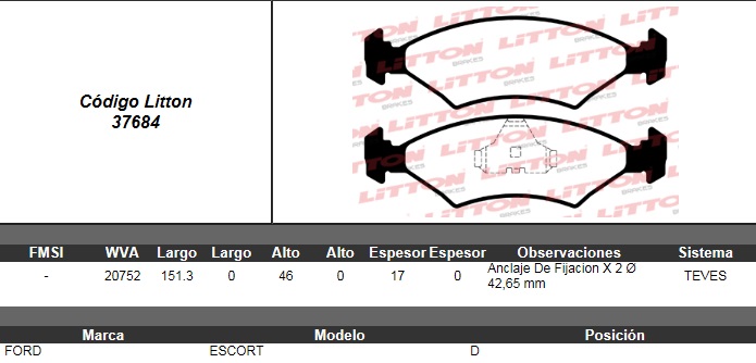 PASTILLA DE FRENO FORD COURIER 1.3 97- COURIER 1.6 97- ESCORT 1.6 93>96- ESCORT 1.8 93>96- FIESTA 98>00- FIESTA 1.4 16V 96- KA 1.6L 01>08- POINTER 1.8 / 2.0 / 2.0 GLI 93>96 DEL. ULT. (--) (PD/34)