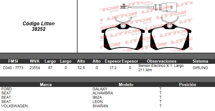 PASTILLA DE FRENO VW. SHARAN 1.8 T 20V/1.9 /2.8 95> / FORD GALAXY 1.9-2.0-2.3-2.8 00/ / SEAT IBIZA IV 03>- IBIZA IV CUPRA 1.8/1.9 04> TRAS. C/SENSOR ULT. (0794) |