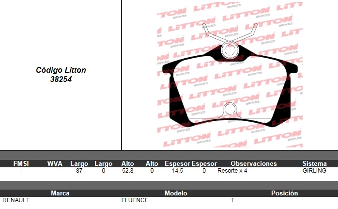 PASTILLA DE FRENO RENAULT FLUENCE 1.6/2.0 16V 10> TRAS. ULT. (--) |
