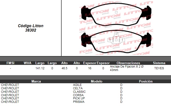 PASTILLA DE FRENO CHEVROLET CELTA 1.0- 1.4 00>11/09- CORSA 1.0- 1.6 94>01- CORSA 1.4 94>99- CORSA PICK UP 1.6 95>- AGILE LTZ FLEX 1.4 09>11/09 DEL. ULT. (0178) (PD/42) |